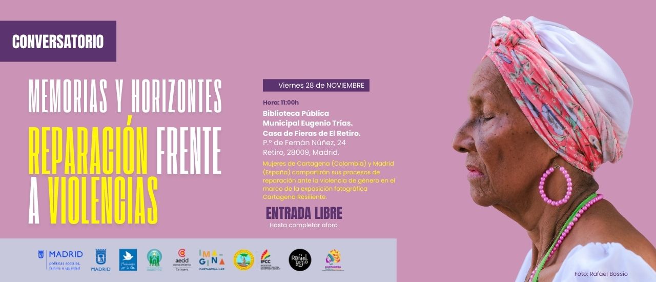 Mujeres de Cartagena de Indias (Colombia) y Madrid (España) comparten sus procesos de reparación ante la violencia de género en el marco de la exposición fotográfica ‘Cartagena resiliente’ en un conversatorio que tendrá lugar el viernes 28 de noviembre de 11:00 a 13:00 horas en la Biblioteca municipal Eugenio Trías, Casa de Fieras de El Retiro, Madrid. La entrada es libre hasta completar aforo.