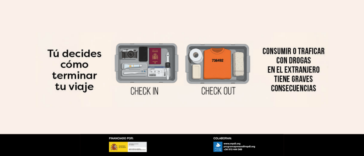 Movimiento por la Paz -MPDL-, en colaboración con el Ministerio de Sanidad y la Delegación del Gobierno para el Plan Nacional sobre Drogas (DGPNSD), ha puesto en marcha la campaña de sensibilización “Tú decides cómo terminar tu viaje”, una iniciativa que busca alertar a las personas viajeras sobre las graves consecuencias legales y personales del consumo o tráfico de estupefacientes fuera de España. La creatividad de la campaña ha sido desarrollada este año por la agencia de Magdalena Jerez Guerrero.