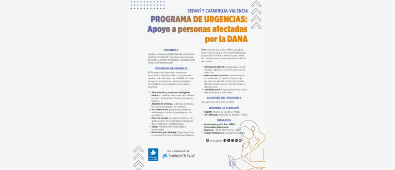 Transcurrido este año 2025, Movimiento por la Paz agradece a la Fundación "La Caixa" (fundacionlacaixa.org), y a los convenios de Colaboración con los Ayuntamientos de Sedaví y Cataroja, la implementación del PROGRAMA DE URGENCIAS, que ha permitido desarrollar diferentes procesos de apoyo a las personas afectadas por la DANA, del pasado 29 de Octubre 2024.